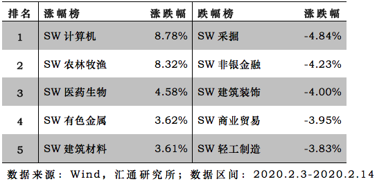 图:申万一级板块2.3-2.14涨跌幅TOP 5