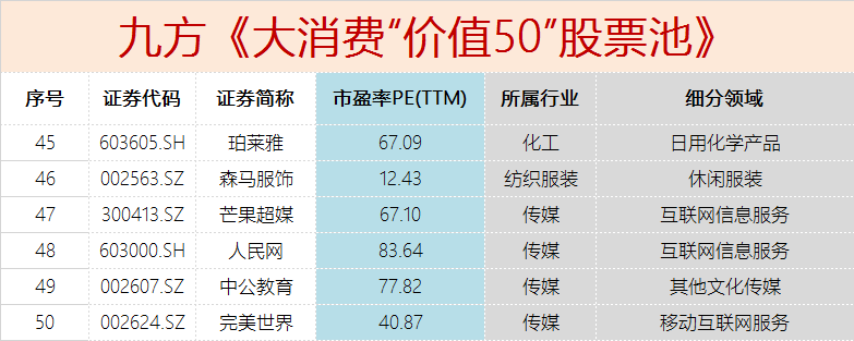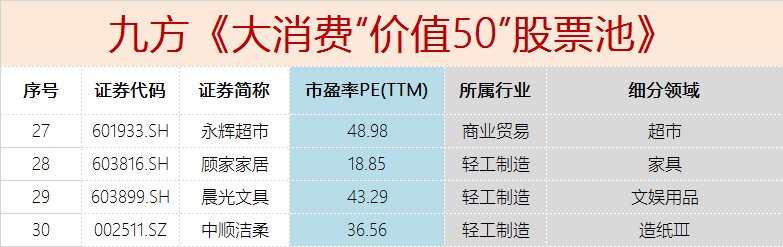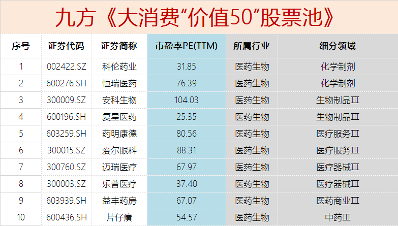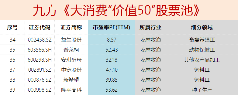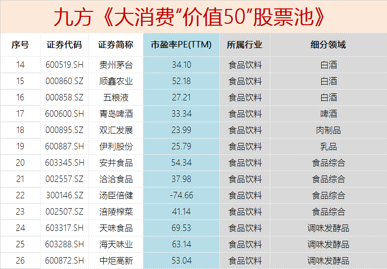 福利来了,九方金融研究所集研究所最高投研实力,深入跟踪,挖掘消费板块价值,梳理出了《2020-大消费“价值50”股票池》,顾名思义就是50只具备投资价值的消费板块股票。票池筛选的目的就是圈定接下来跟踪的消费股标的,锁定目标,不让自己的精力太过分散,做到优中选优!