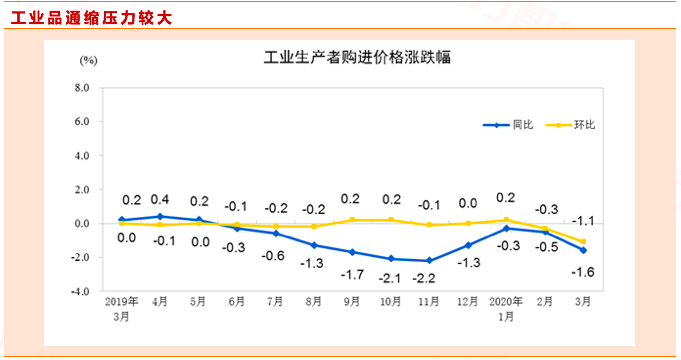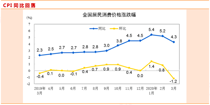 2020年4月10日,统计局发布的数据显示,3月份全国居民消费品价格指数(CPI)同比上涨4.3%,低于预期4.7%和前置5.2%,CPI环比下降1.2%。按细项来看,食品烟酒类价格上涨13.6%,鲜菜、猪肉、鸡蛋和水产价格环比分别下降12.2%、6.9%、 5.1%和3.5%。3月工业品价格指数(PPI)同比下降1.5%,低于前值0.4%和预期1.1%。环比下降1.0%。其中工叶生产者购进价格指数下降1.6%,环比下降1.1%。生产资料环比跌-1.2%,生活资料环比跌-0.2%。