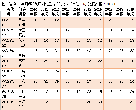我们统计了近10年,归母净利润连续正增长的公司,截至2020.3.11,一共有31家公司满足条件,另外还有不到20家过往9年连续增长,但目前还没有公布2019年业绩的公司。可见,看上去比较宽松的选股条件——连续10年正增长,其实能够满足条件的公司并不多,50家不到。