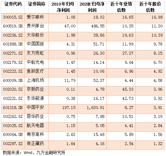 表的最后两列,两个指标的含义解释一下。近十年业绩倍数是指,2020年预期的归母净利润除以2010年归母净利润得到的倍数,说白了就是公司现在赚的钱是十年前的多少倍。同理,股价倍数就是用最新的收盘价,除以十年前的收盘价得到的倍数,判断的是你的资产如果十年前买了这家公司,现在翻了多少倍。