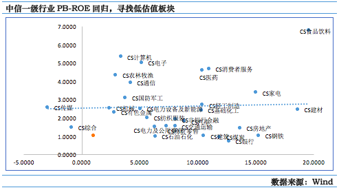 每个行业或公司均有其特定的盈利能力(ROE),和估值水平(PB),因此我们可以将所有行业放在一起进行回归分析,位于回归线左上方的可以理解为已经高估的行业,而位于回归线右下方的可以理解为目前受到低估的行业。基于以上方法,我们对中信行业分类的29个行业进行回归分析。从下图可以看出,房地产、建筑、建材、银行等周期股处于低估区域。