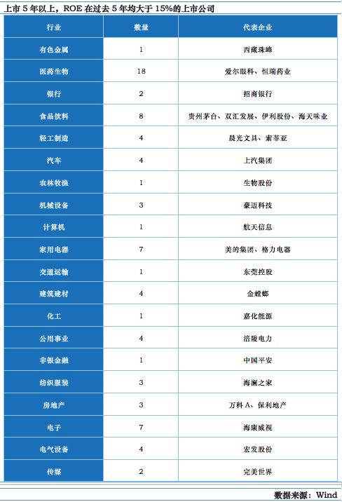 那么这一指标是否适合用于筛选A股的上市公司呢?我们选取已经上市5年以上,ROE在过去5年均大于15%的上市公司,可以看到大部分集中在大消费(食品饮料、家用电器、轻工制造、生物医药)和TMT行业,其中很多公司均为各行业的龙头企业,例如贵州茅台、格力电器等等,也是过去几年的大牛股。由此可见,ROE的高低作为选股的核心参考指标之一确实有其重要的意义。