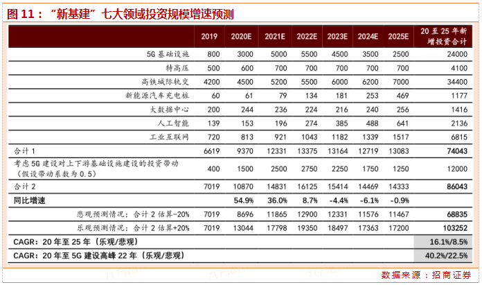 根据招商证券预测,悲观/乐观情况下,2020年至2025年“新基建”7大领域以及5G带动的上下游基建新增投资合计规模为6.9万亿/10.3万亿,复合增速CAGR为8.5%/16.1%。5G基础设施投资高峰主要为2020-2022年,估算2020年至2022年复合增速CAGR悲观/乐观为22.5%/40.2%。我们看下图的七大领域合计同比增速就会发现,投资增速最快的时期就是今明两年。