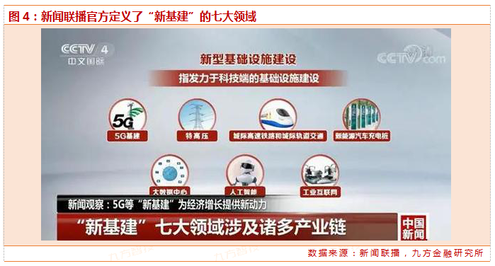 此前官方一直没有给出一个明确的定义。一直到2020年3月4日,新闻联播正式宣布新基建的定义,这才被广泛的知晓。结合前面百度指数的爆发节点看,两者时间节点非常的吻合。