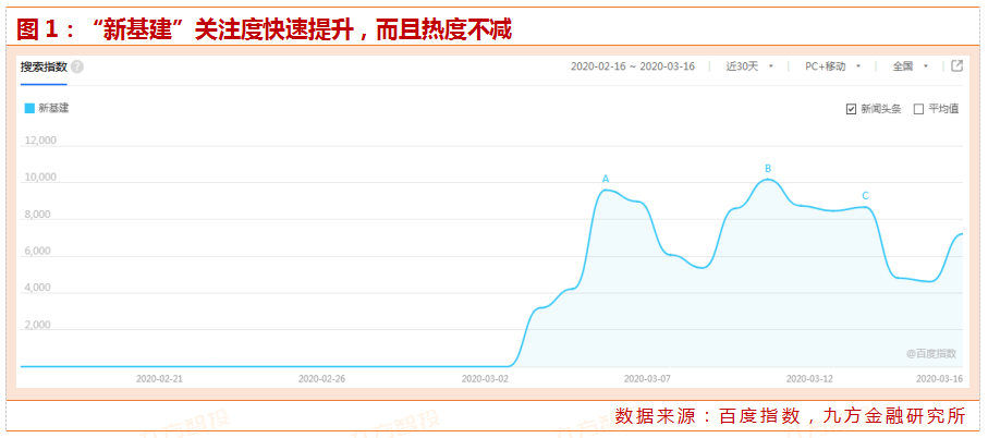 近期“新基建”成为资本市场乃至全社会关注的焦点。据百度指数,“新基建”3月2日搜索指数还为0,但3月3日起就呈现爆发式的增长。