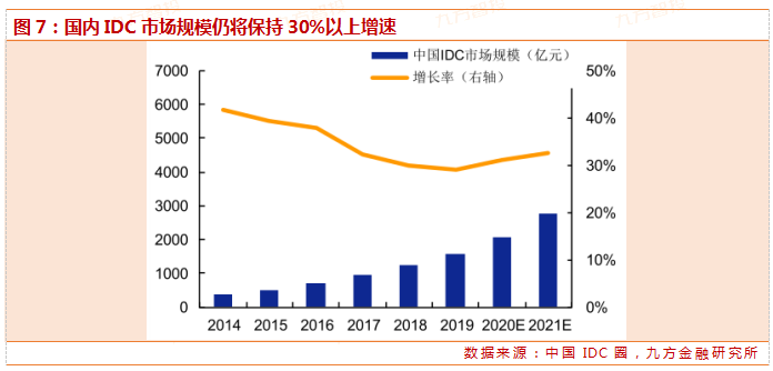 从IDC发展阶段来看,我国IDC发展尚处于以新建为主的粗犷式发展阶段,国内IDC市场增速远高于全球,尚具备较大发展空间。全球最大的IDC市场美国已经进入行业整合阶段,我国目前仍以新建为主,市场增速高于全球水平。