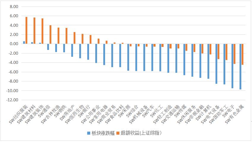 我们看到,建筑材料、农林牧渔、钢铁、房地产,这些我们上周都有提到过,获取了明显的超额收益,而电子、军工、计算机等上周我们提到需要谨慎对待的板块,跌幅非常的明显。