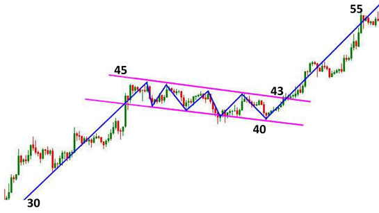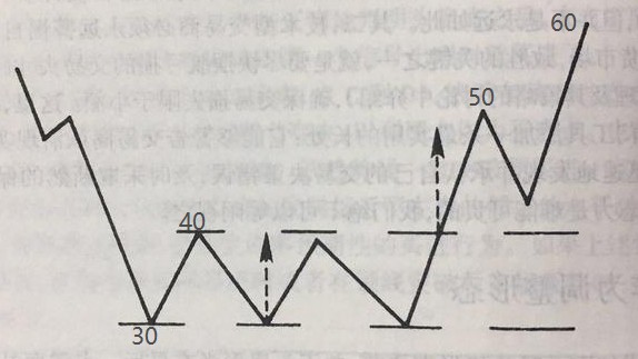 上图为下跌中继形态,是上涨中继形态的反向,这个就不太适用于股市中的止盈,但适合做一些期货或贵金属的做空交易,道理和上涨中继形态相似。做空时的最佳卖点为突破颈线的43元,止盈点设为x,55-40=45-x,x=30,则止盈点设在30元附近。