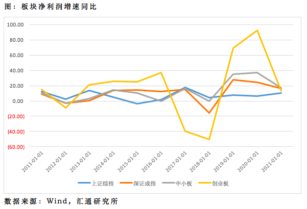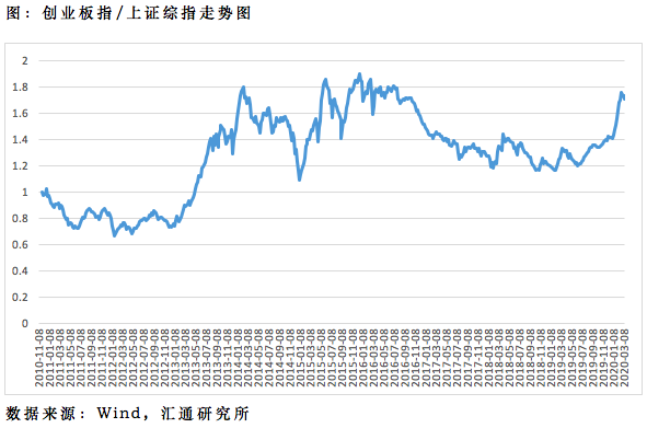 从下图看出,创业板指相对上证综指走强,是从2013年初开始,整整持续了一年多的时间,后来创业板指有短暂修整,之后15年再次拉升,一直持续到2016年。但是从2016年到2019年中旬,创业板指相对一直弱势,直到去年三季度有大幅拉升,一直持续至今。可见,创业板指相对大盘走强,其背后有业绩的趋势性走强支撑。