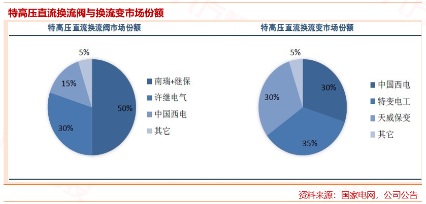 特高压直流项目的核心设备为换流阀和换流变。在换流变领域,国内的主要生产商为中国西电、特变电工、天威保变,在换流阀项目上,国电南瑞和许继电气竞争优势明显,占比分别达到50%和30%;直流控制保护系统的参与者则主要是国电南瑞和许继电气。