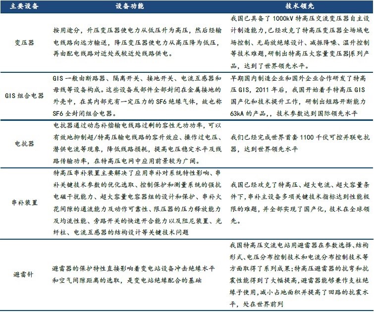 交流特高压主要设备:包括变压器、电抗器、开关设备、串联补偿装置、互感器、电容器、避雷器等。经过多年的发展,我国交流特高压关键设备具备较强的自主设计制造能力,处在全球领先水平。
