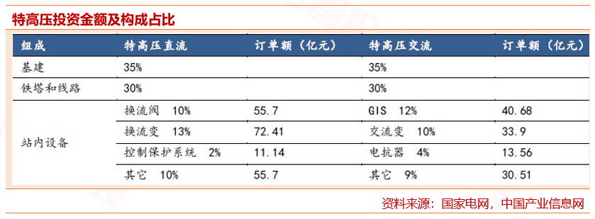 交流特高压设备采购的主要产品为:GIS、变压器、电抗器,三项设备总投资占线路总投资的26%。直流特高压设备采购的主要产品为换流阀、换流变压器和控制保护系统,三项设备总投资占线路总投资的25%。本轮投资中交流项目约339亿、直流项目约577亿,能够带动主设备厂商订单额总计超过300亿元。