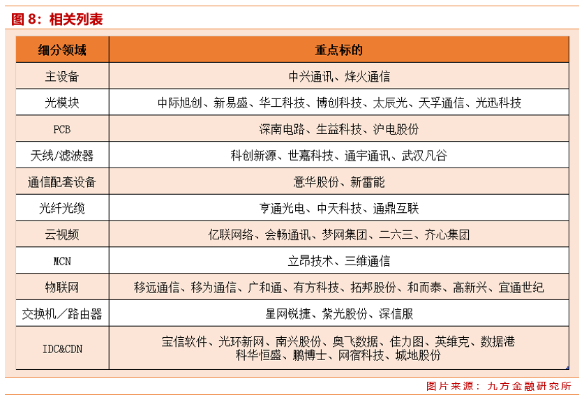 简言之,5G规模集采持续落地,5G产业链加速推进,同时运营商牵头培育5G新应用,5G新基建将带动网络设备和终端应用比翼齐飞。按5G建网周期看,当前网络综合设备网络设备采购将大幅增加,核心设备商以及其供应商先行受益,同时5G网络建设带来数据中心的需求,服务器、连接器、光模块以及机房需求的大增,这些是接下来成长性和确定性都较高的行业。