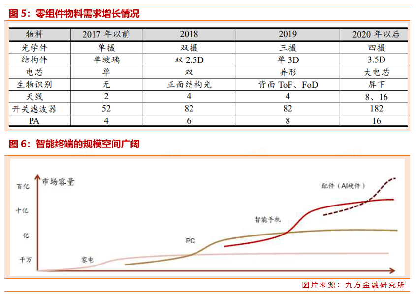 智能终端方面,5G手机进入导入期,智能可穿戴终端进入高速成长期。在智能手机整体渗透率处于成熟状态的情况下,行业发展的机会主要在于技术创新带来的结构性变化,光学、屏下指纹、折叠屏、天线、射频等零组件需求有望显著增长。