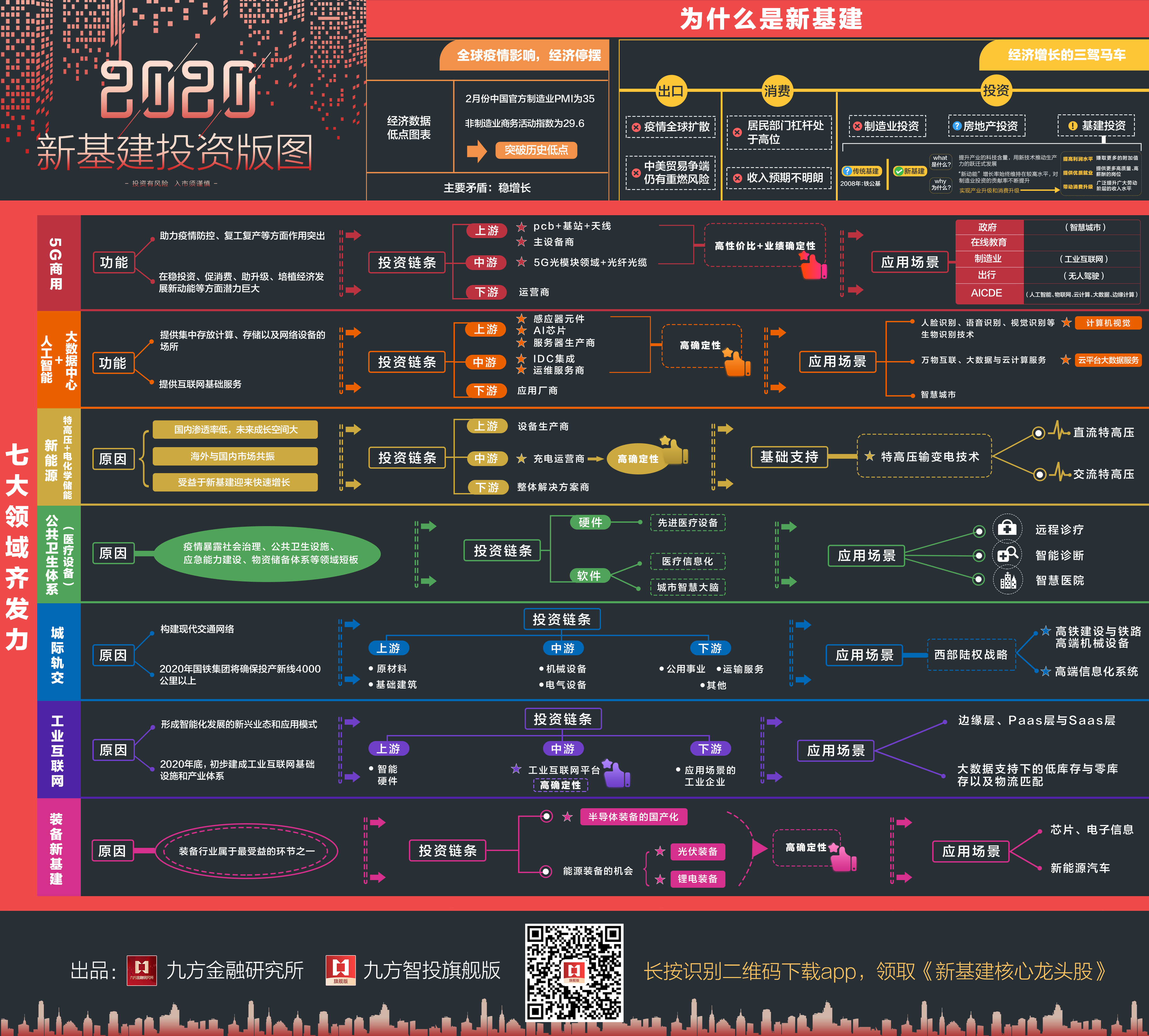 下图是九方金融研究所团队为投资者朋友们从7大领域中大产品背景、投资链条及应用场景,提炼出来的新基建投资版图,您可以点击图片保存到相册,在电脑上放大查看细节分析逻辑哦~