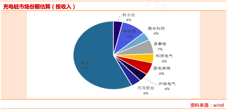 根据充电桩设备收入来计算,目前市场份额占比较高的公司包括国电南瑞、特锐德、易事特、万马股份等。充电桩、充电站设备市场相对分散,主要原因在于此前的招标主体相对分散。随着新基建加速落地,充电桩的招标和建设主体回归国网,市场份额很可能向头部企业集中。预计头部企业将率先受益。