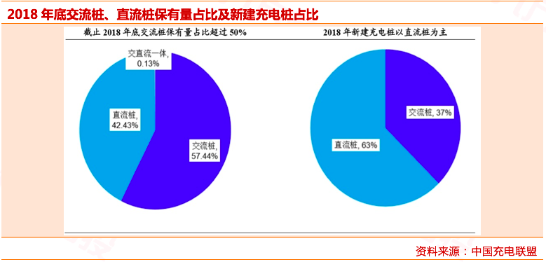 交流桩保有量大于直流桩,但新增充电桩建设来看直流桩占据主导。从应用范畴来看交流桩因为其度电成本较低大多作为家庭私人桩,从目前保有量来看其占比达到57%左右。但值得注意的是直流桩尽管其单桩制造、建设和运营成本都要远高于交流桩,但是考虑到其功率高、充电速度快等特点,其越来越受到市场的主流欢迎;尤其是针对充电站来说直流桩占据较大比重。根据充电联盟的统计数据来看,2018年新增的公共充电桩数量达到93943个,其中直流桩增量为58756个,占比63%,是目前充电桩建设的主流,而交流桩增量则为35184个,占比37%。
