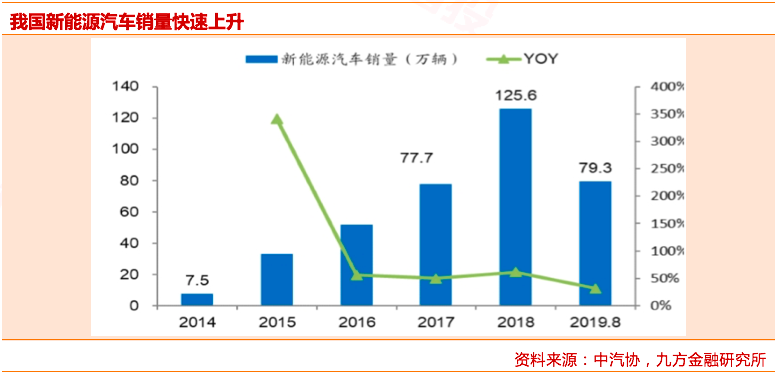 新能源汽车发展是大势所趋。自2012年国务院发布《节能与新能源汽车产业发展规划》以来,财政补贴、税费减免等措施使我国新能源汽车产业蓬勃发展;同时考虑我国在动力电池领域的完善的产业链布局和材料优势,我国新能源汽车销量始终位居全球前列。2018年我国新能源汽车销量达到125.6万辆,同比增长61.7%,销量为2014年的16倍;2019年1-8月累计销售新能源汽车79.3万辆,同比增长32%。随着财政补贴的逐步退出,我国推出了双积分政策将进一步从市场化的角度引导新能源汽车的发展。而从全球范围来看,以德国、瑞典等为代表的发达国家纷纷公布禁售燃油车时间表;同时奔驰、丰田等传统老牌车企也加大在新能源汽车领域的布局,在当前能源变革的时代,汽车电动化已是大势所趋。