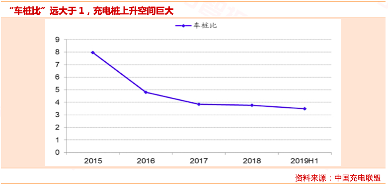 就需求端而言,新能源汽车保有量远多于充电桩数,“充电难”是行业以及车主面临的难题,在此刺激下充电桩建设速度不断加快。2015年时新能源汽车与公共桩保有量比值为7.97,截至2019年6月底该比值已经下降至3.5:1。